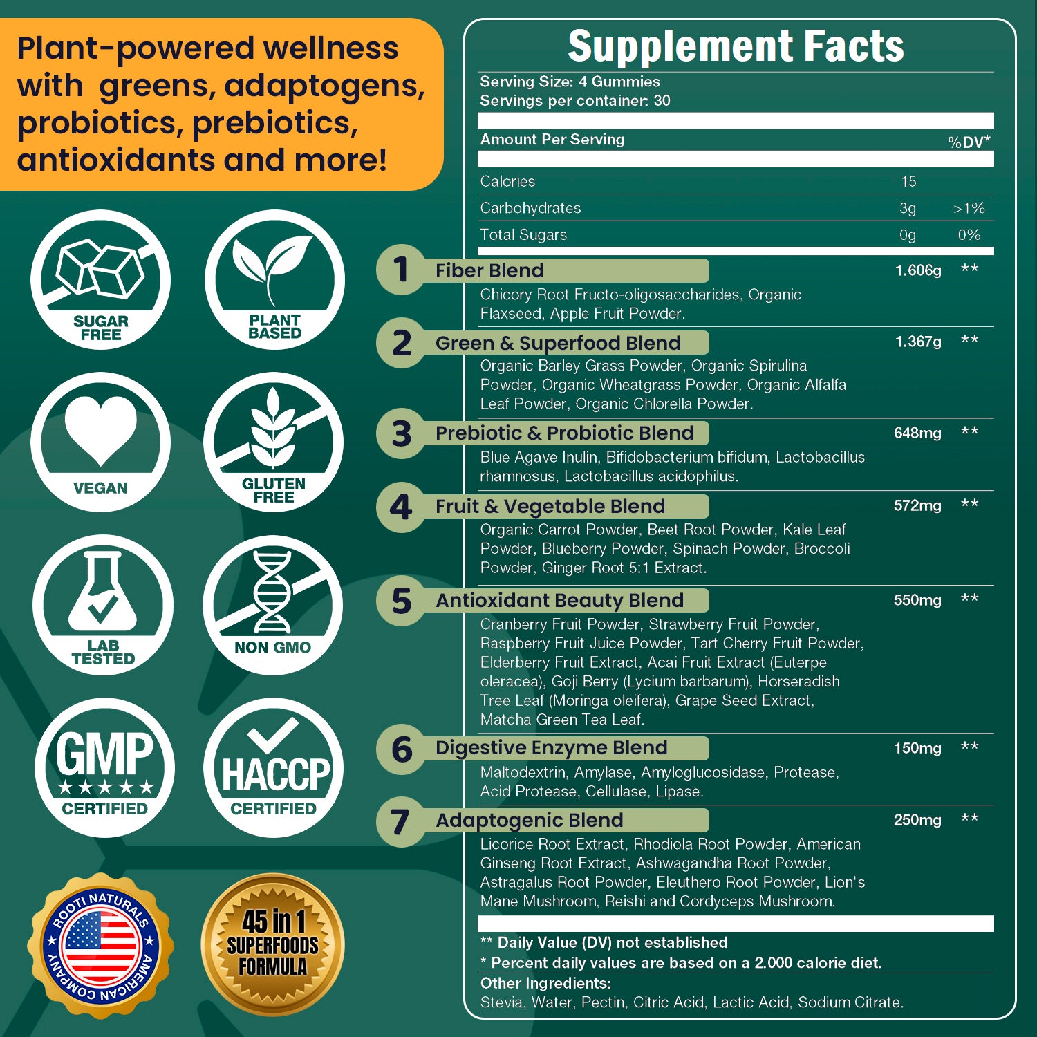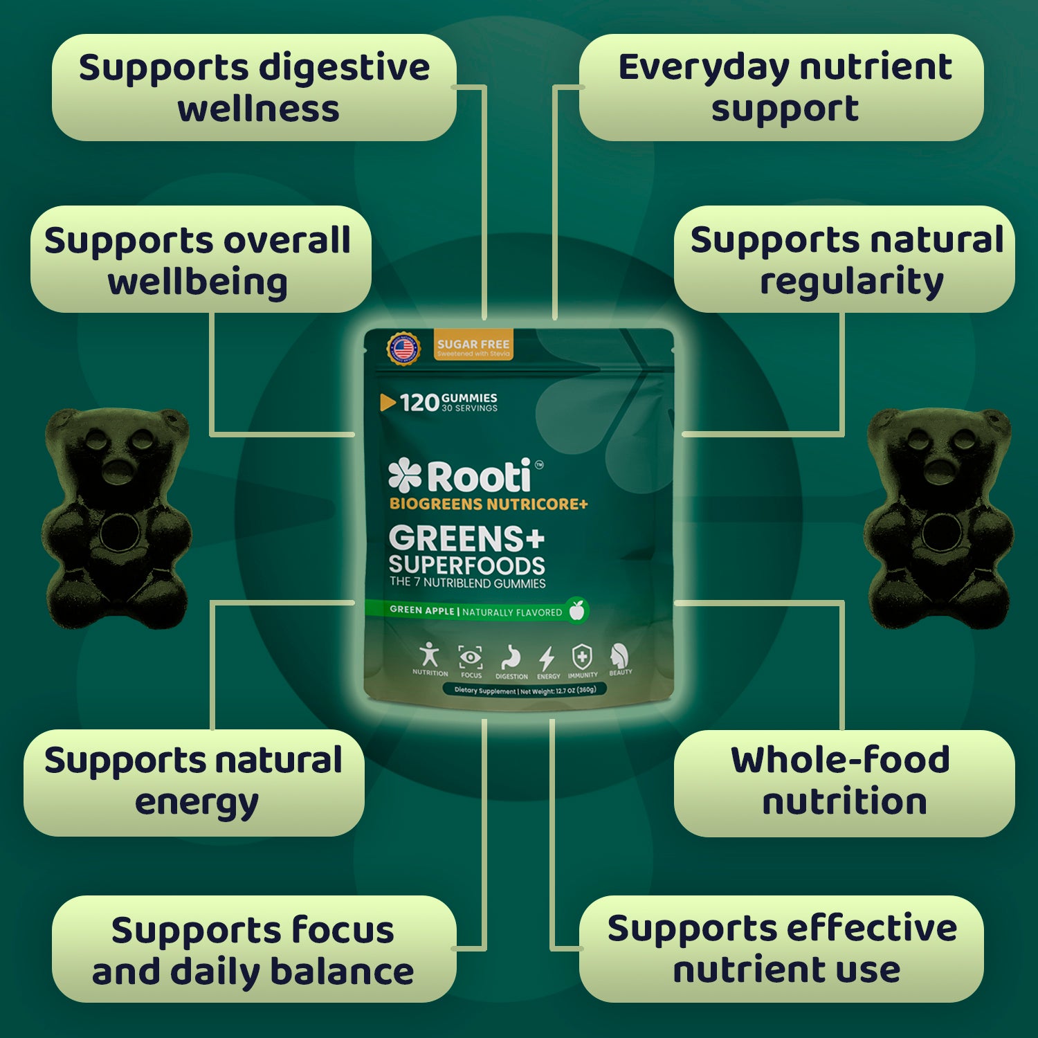 Rooti’s blend of organic greens, reds, and superfoods supports digestion, immunity, and daily energy — all in a delicious, plant-based gummy.