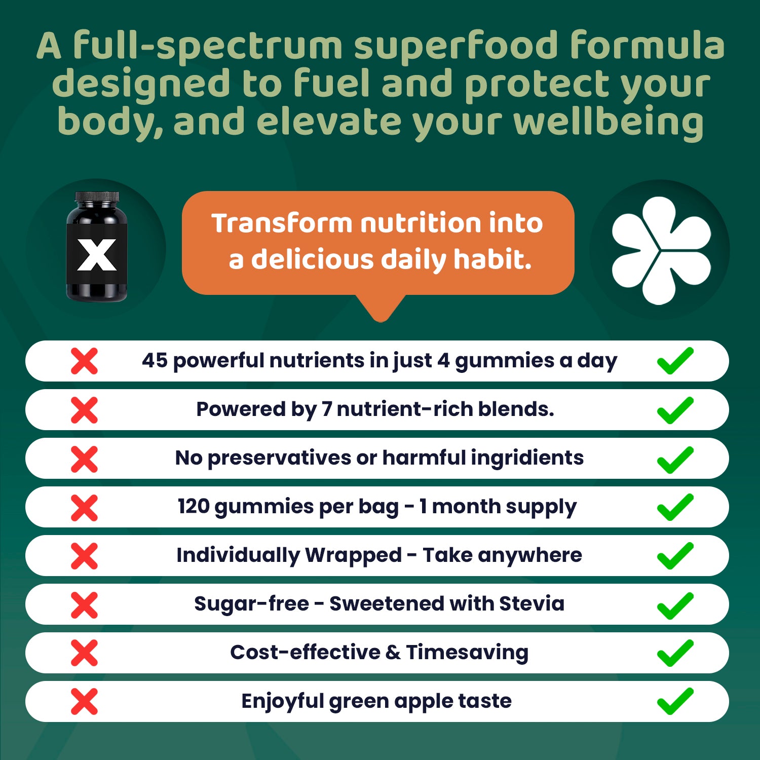 A potent fusion of 40+ organic greens, reds, and superfoods to nourish your gut, fuel immunity, and boost energy — naturally and deliciously.