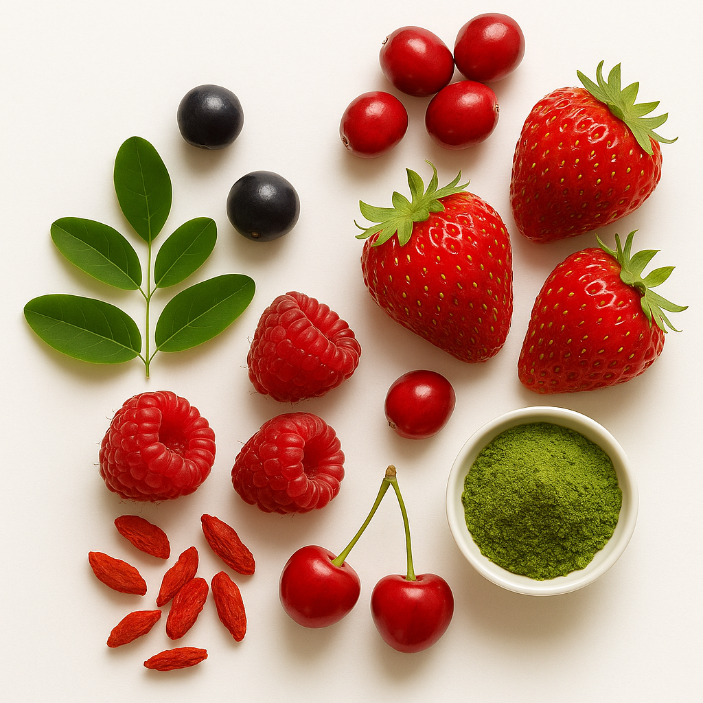 Cranberry Fruit Powder, Strawberry Fruit Powder, Raspberry Fruit Juice Powder, Tart Cherry Fruit Powder, Elderberry Fruit Extract, Acai Fruit Extract (Euterpe oleracea), Goji Berry (Lycium barbarum), Horseradish Tree Leaf (Moringa oleifera), Grape Seed Extract, Matcha Green Tea Leaf